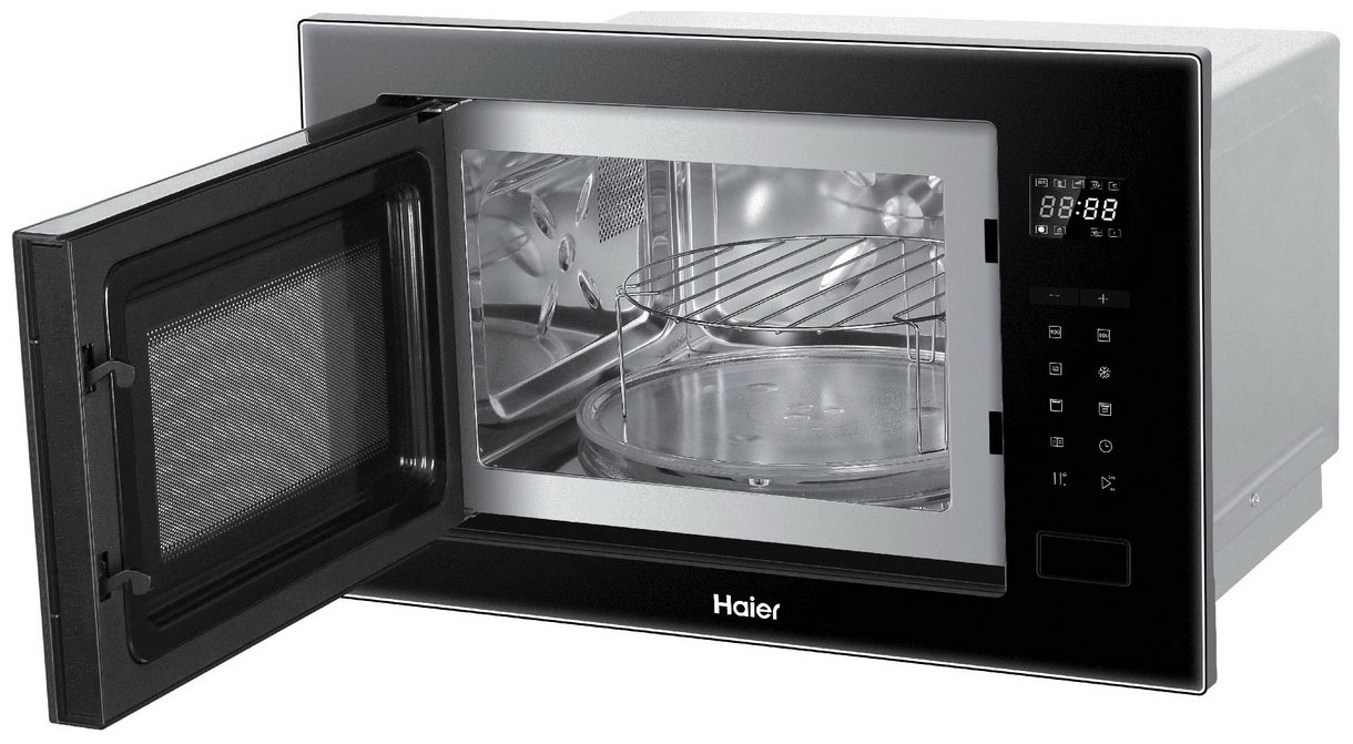 Встраиваемая микроволновая печь Haier HMX-BTG259B займет достойное место на кухонном столе, будет особенно эффектно смотреться в тандеме с черной духовкой или плитой. Вместительная камера на 25 л дополнена поворотным столом со стеклянным блюдом диаметром 31.5 см и грилем. Вы можете использовать 8 автоматических программ, включая режимы разогрева и разморозки.